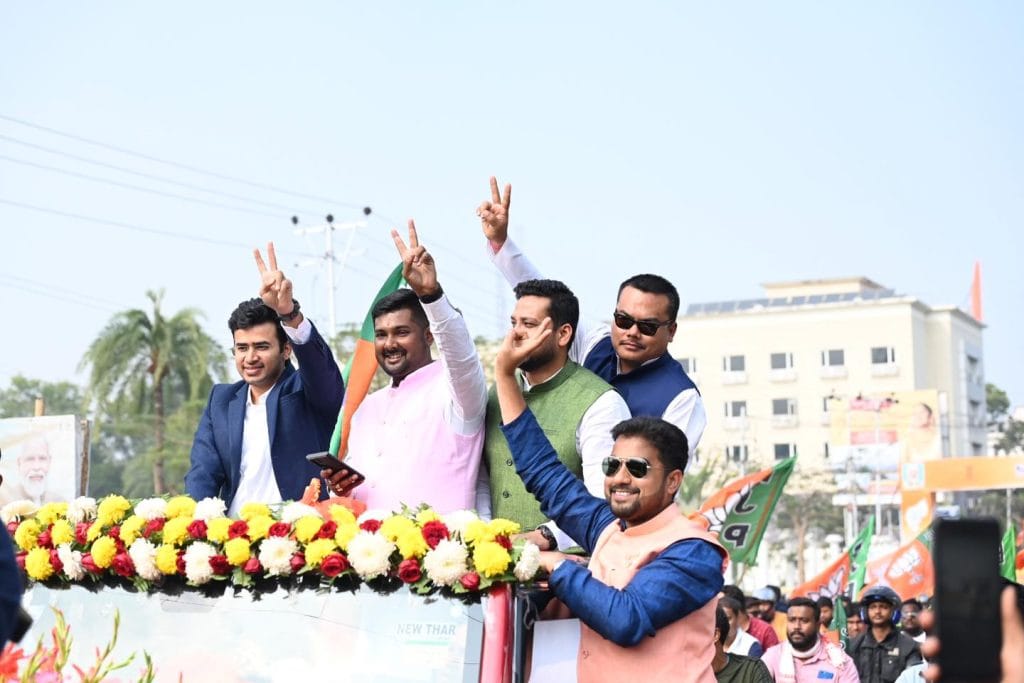 কেন্দ্রীয় সভাপতির সামনে শক্তি প্রদর্শন করল প্রদেশ যুব মোর্চা। বুধবার দুই দিনের রাজ্য সফরে এলেন ভারতীয় জনতা যুবমোর্চা রাষ্ট্রিয় সভাপতি তেজশ্বী সুর্য। বিমানবন্দর থেকে এক বিশাল জনসভার মধ্য দিয়ে রাষ্টিয় সভাপতিকে স্বাগত জানাল প্রদেশ যুব মোর্চা কর্মীরা। আর বিমানবন্দর থেকে ফেরার পথে গাড়ির উপর দাড়িয়েই প্রদেশ সভাপতি নবাদল বনিকের নেতৃত্বে যুবমোর্চার জোশকে সালাম করলেন রাষ্ট্রিয় সভাপতি।