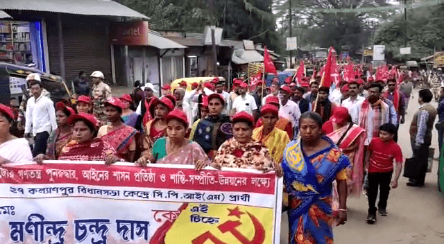 কল্যানপুরঃ আসন্ন বিধানসভা নির্বাচনে ২৭ কল্যাণপুর প্রমোদনগর বিধানসভা কেন্দ্রর সিপিআইএম মনোনীত প্রার্থী মনিন্দ্র চন্দ্র দাস কে জয়যুক্ত করার লক্ষ্যে এক মিছিল ও সভা সংগঠিত হয় কল্যাণপুর সোনার তরী মুক্তমঞ্চে । মঙ্গলবার বিকাল ৪ টানা গাছ সুসজ্জিত মিছিল করে সিপিআইএম কর্মী সমর্থকরা সিপিএমের মনোনীত প্রার্থী মনিন্দ্র চন্দ্র দাস কে কল্যাণপুরে বিভিন্ন পদ পরিক্রমা করে মিছিল সংঘটিত করে । কল্যাণপুরের বিভিন্ন পদ পরিক্রমা করে সোনার তরী মুক্ত মঞ্চে এক সভা অনুষ্ঠিত হয় । সবাই সিপিআইএম মনোনীত প্রার্থী মনিন্দ্র চন্দ্র দাস কে ভোট দিয়ে জয়যুক্ত করার আবেদন জানান মনীন্দ্র চন্দ্র দাস , সংক্ষিপ্ত আলোচনায় মনীন্দ্র চন্দ্র দাস বক্তব্য রাখতে গিয়ে বলেন, রাজ্যের গণতন্ত্র পুনরুদ্ধার ও আইনের শাসনকে ফিরিয়ে আনার লক্ষ্যে এবং এই ২৭ কল্যাণপুর কেন্দ্রের বিভিন্ন উন্নয়নের কাজ করতে এবং সার্বিক মানুষের সহযোগিতা করতে মন নিন্দ্র চন্দ্র দাস কে ভোট দিয়ে পবিত্র বিধানসভায় পাঠানোর জন্য আহ্বান জানান তিনি ।